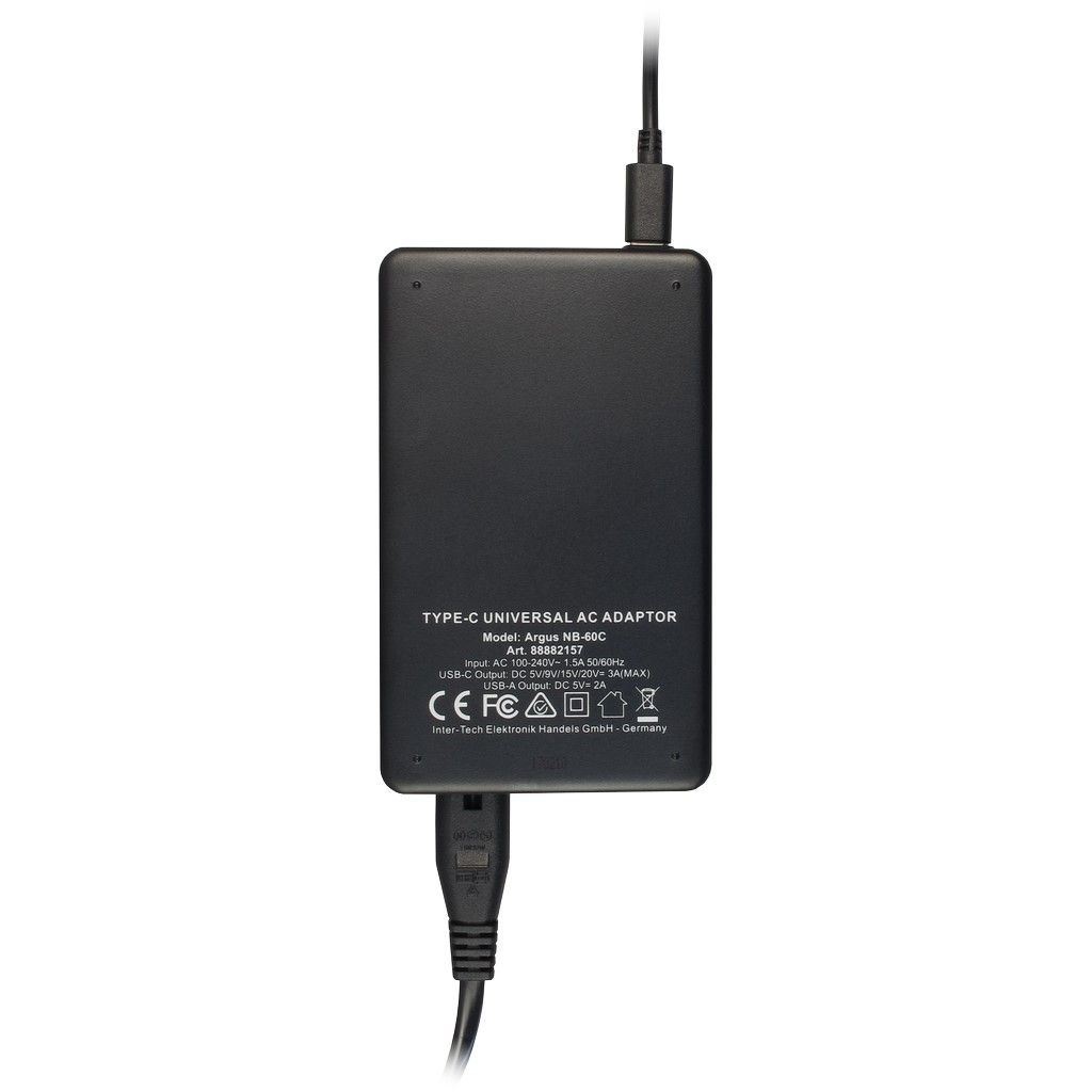 Inter-Tech Argus NB-60C 60W, adaptor de notebook universal, eficienta de pana la 91%, putere: 60W, selectie automata a voltajelor in functie de dispozitivul conectat (voltaj 5-20V, 3A maxim), conectori: USB Type-C (5-20V, 3A max.) / USB Type-A (5V, 2A max.), protectii: Over voltage protection, Over current protection, Over Load protection, Over Temperature protection, dimensiuni: 17 x 69 x 112mm, compatibil cu: Apple New MacBook 12”, OnePlus Two, Google Nexus 5X, Nexus 6P, Pixel C, ChromeBook si majoritatea dispozitivelor compatibile USB Type C, greutate: 165g