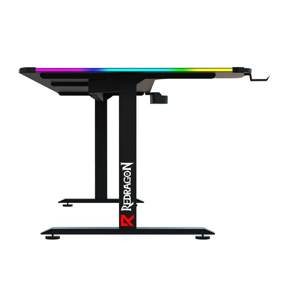 Birou gaming Redragon GD-3200-L negru iluminare RGB, structura din otel, biroul este iluminat RGB, forma blatului este de tip “L”, suprafata lucru tip carbon, dimensiune suprafata birou: 160x60x100cm, suport pahar, suport casti, greutate maxima admisa: 60 kg