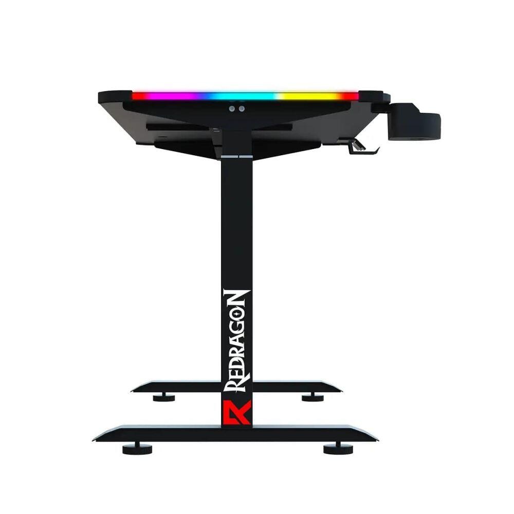 Birou gaming reglabil electric pe inaltime Redragon GD-3330-M negru iluminare RGB, structura din otel, biroul este reglabil electric pe inaltime,se pot seta 3 profile accesibile folosind butoanele de la 1 la 3, se pot programa setari automate pentru diferite inaltimi in functie de momentul zilei, sistem de protectie anti-coliziune pentru deplasarea pe verticala, lateralele sunt iluminate RGB, dimensiune suprafata birou: 140x60cm, inaltime blat: 72-117cm, suport pahar, suport casti, greutate maxima admisa: 60 kg