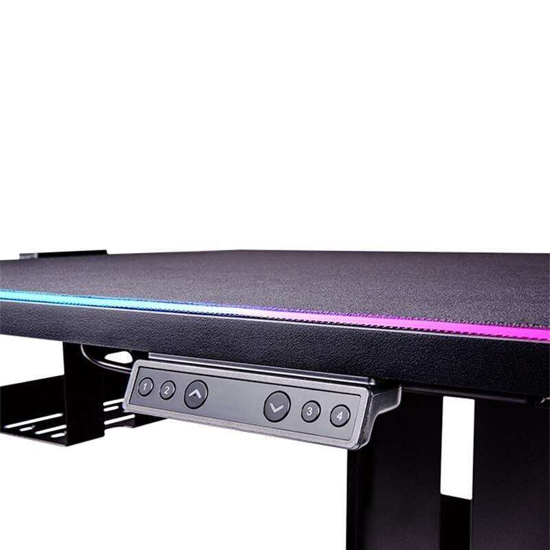 Birou gaming reglabil electric pe inaltime Thermaltake CycleDesk 100 negru iluminare RGB, structura din fier, biroul este reglabil electric pe inaltime,se pot seta 4 profile accesibile folosind butoanele de la 1 la 4, se pot programa setari automate pentru diferite inaltimi in functie de momentul zilei,include display pentru afisarea inaltimii, poate fi folosit pentru gaming, office sau antrenamente de ciclism, suprafata biroului este acoperita in intregime cu un mousepad rezistent la apa, biroul este iluminat RGB fiind configurabil prin intermediul aplicatiei iTake (5 moduri de iluminare), include modul WiFi, dimensiune suprafata birou: 80x50cm, inaltime blat: 72-117cm, suport pentru laptop, sistem pentru organizarea cablurilor sub blat