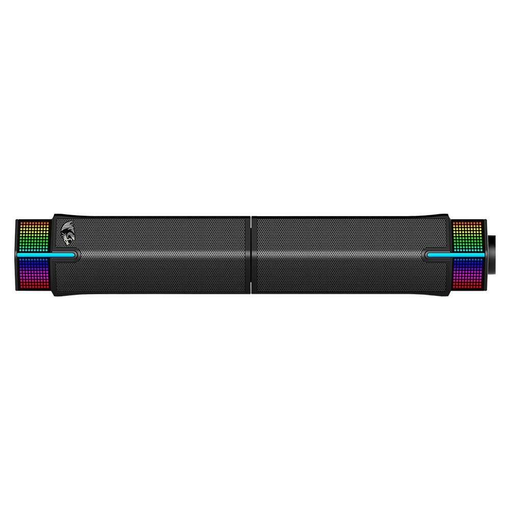 Boxe Bluetooth Redragon Yorick negre iluminare RGB, putere: 4W RMS (2W x 2), versiune Bluetooth: 5.3, design transformabil (se pot folosi ca boxe stereo sau se pot conecta devenind un soundbar), dimensiune difuzoare: 2x 2”, raspuns in frecventa: 60Hz – 20KHz, conexiuni: input: 1x USB sau Bluetooth, dimensiuni: 205x93x70mm
