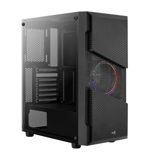Carcasa Aerocool Menace Saturn V1 iluminare FRGB neagra, SPCC Steel ATX Mid Tower, fara sursa (tip ATX, montata jos), interior vopsit negru, 2×3.5” (1 x 3.5” sau 1 x 3.5”/2.5″ intern), 3×2.5” (2 x 2.5” sau 1 x 2.5”/3.5” intern), fata – 1x 120mm LED fixed RGB fans (inclus) / 2x 120mm / 2x 140mm fans (optional), spate – 1x 120mm fan (optional), tavan – 2x 120mm fans (optional), podea – 2x 120mm fans (optional), design premium cu panou lateral din sticla securizata, 2x USB 3.0, HD Audio ATX / microATX / Mini-ITX, sloturi expansiune: x7, inaltime maxima cooler procesor: 157mm, lungime maxima placa video: pana la 317mm fara radiator montat, suport radiatoare water cooling: fata – 1x 120/240mm, spate – 1x 120mm, dimensiuni: 205x457x392mm