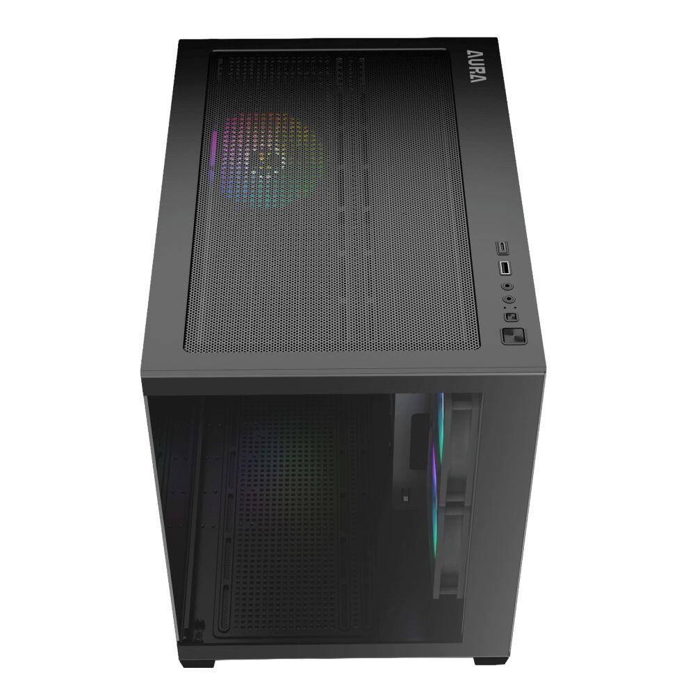 Carcasa Gamdias Aura GC10M V2 aRGB neagra, SPCC & ABS & Tempered glass, Micro Tower Case, interior vopsit negru, 1 x 3.5" sau 1 x 2.5" si 3x 2.5”, spate – 1x 120mm aRGB LED Fans (inclus), tavan – 3x 120mm fans (optional), lateral – 2x 120mm aRGB LED Fans (inclus), podea – 3x 120mm fans (optional), 1x USB Type-C, 1x USB 2.0, HD Audio, Micro-ATX/Mini-ITX, design premium panoramic din sticla securizata, sloturi expansiune: x5, inaltime maxima cooler procesor: 165mm, lungime maxima placa video: 400mm, lungime maxima sursa: 160mm, suport radiatoare water cooling: tavan – 1x 280/360mm, lateral – 1x 280mm, spate – 1x 120mm, dimensiuni (LxWxH): 420x285x365mm, greutate: 5.07kg