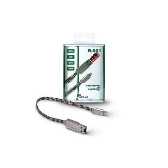 Inter-Tech Argus R-001 Card Reader, conectori: USB 2.0/Lightning (MFi), compatibil: TF, microSD, microSDHC, microSDHX, capacitati de memorie suportate: 8, 16, 32, 64, 128GB, formate de partitii suportate: FAT, exFAT, functie de incarcare (pana la 2.1A), dimensiuni (h/w/d): 7 x 13 x 255mm