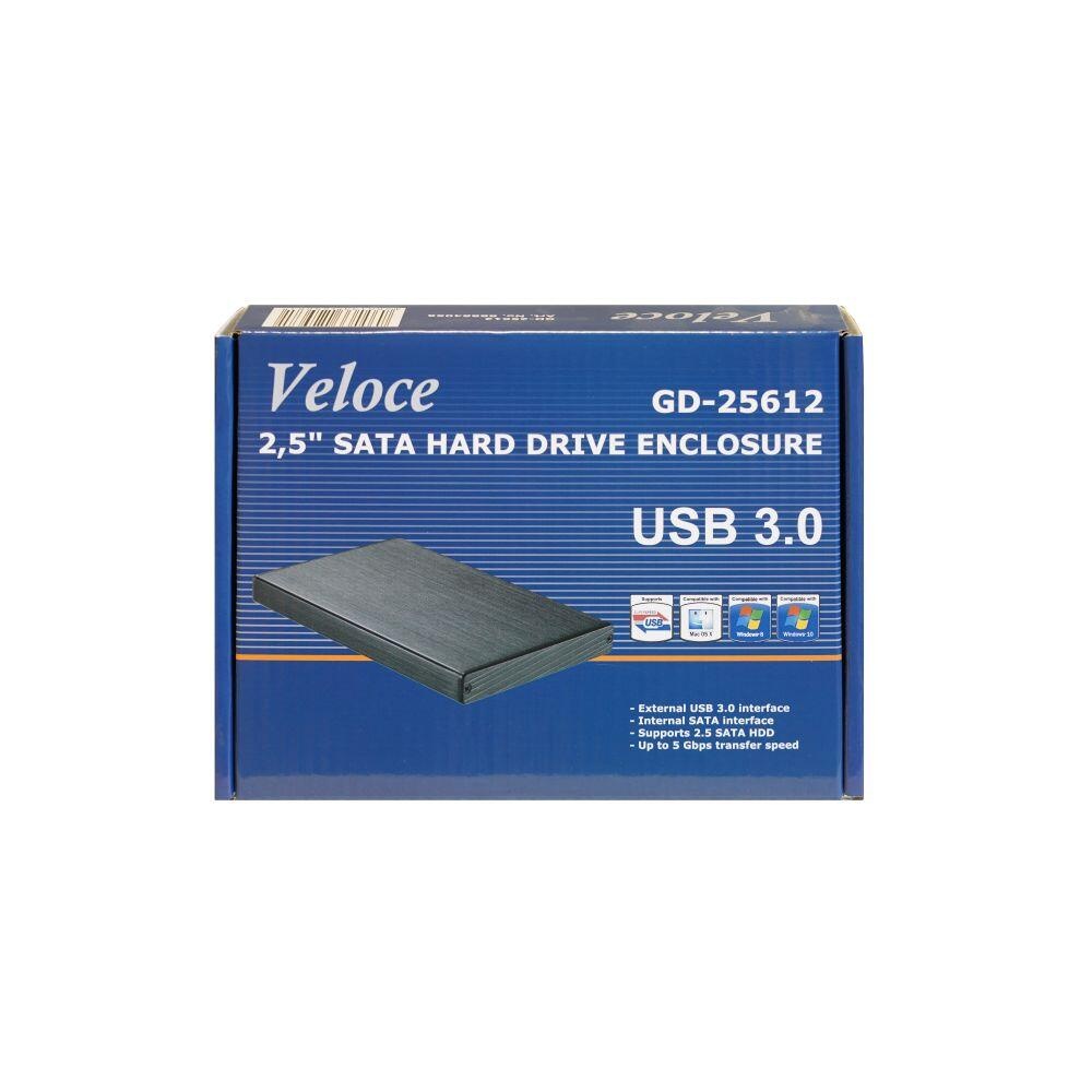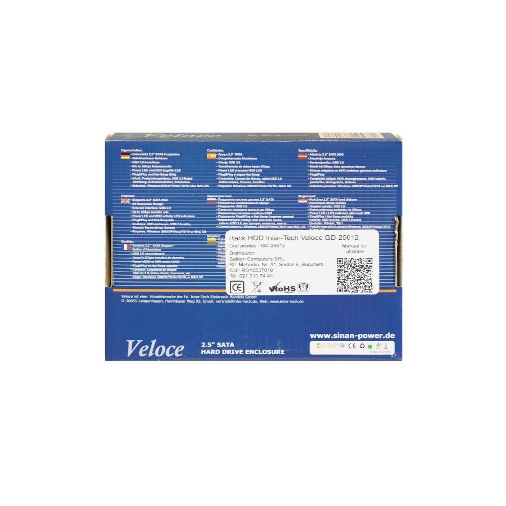 Inter-Tech Veloce GD-25612 USB 3.0, compatibil cu HDD 2.5” SATA (grosime maxima 9.5mm), capacitate maxima: 4TB, conectivitate USB 3.0, constructie din aluminiu, include cablu USB 3.0, plug and play, dimensiuni: 78 x 13 x 132mm