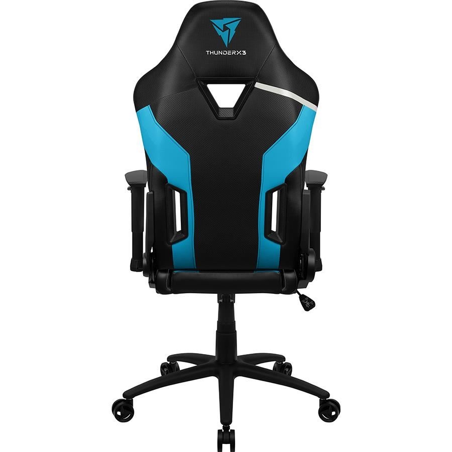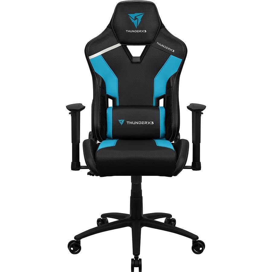 Scaun gaming Thunder X3 TC3 negru cu albastru, permite diverse reglaje: inaltime, inclinare, rotire 360°, balans 3°-18°, inaltime scaun: 118-128cm, inaltime sezut: 47-57cm, inaltime spatar: 81cm, latime spatar: 55cm, latime sezut: 52cm, adancime sezut: 52cm, material captuseala: Leatherette with carbon pattern, echipat cu piston cu gaz clasa 4, inclinare spatar: 135°, include perna lombara si cervicala, greutate maxima suportata: 125kg, manere 2D