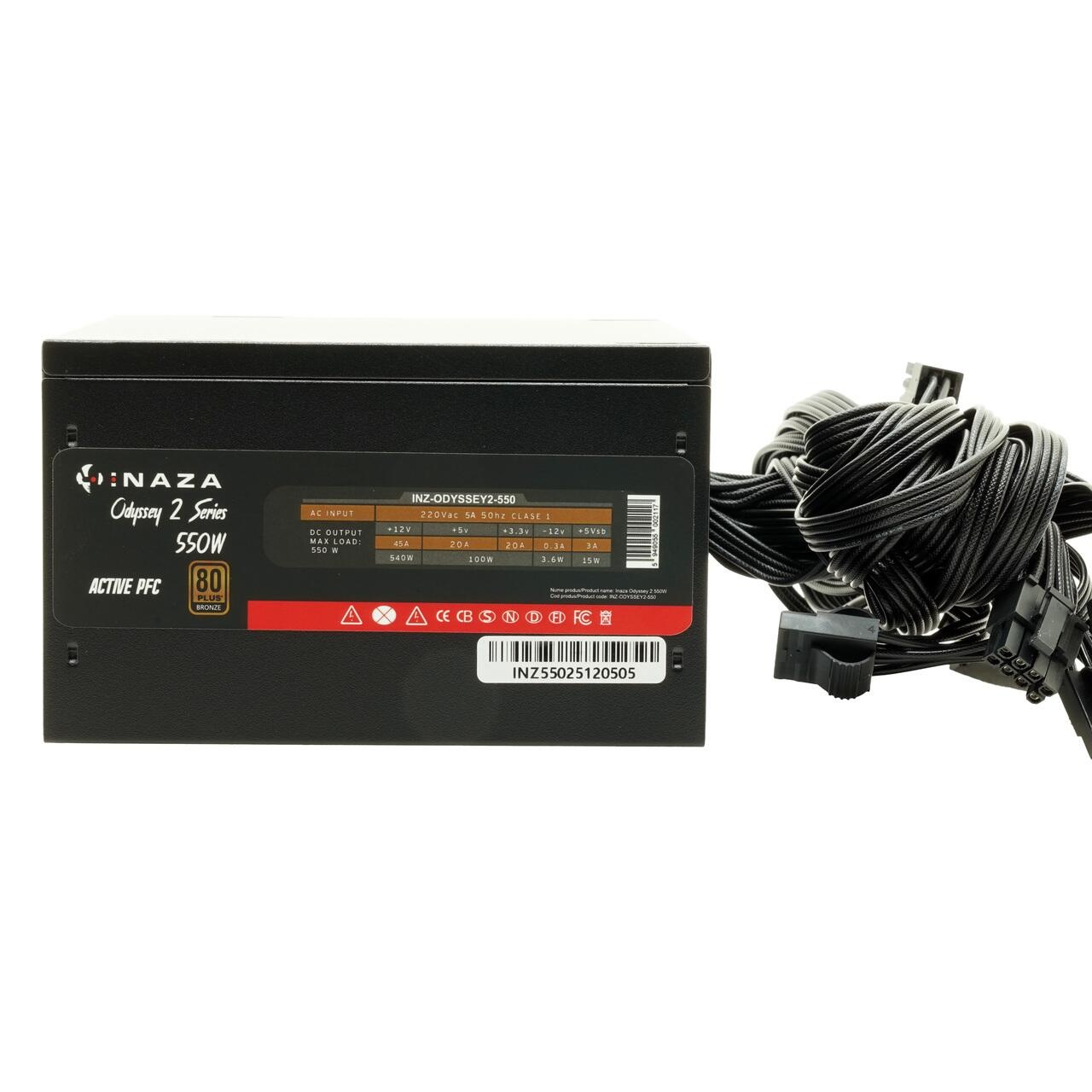 Sursa Inaza Odyssey 2 550W 80Plus Bronze, certificare 80 PLUS BRONZE, eficienta aproximativ 82%, single rail (45A), ventilator silentios de 120mm cu control termic automat, cabluri plate pentru un mai bun wire management, 2x 6+2pin PCIE, 4x SATA, 2x Molex, 1x 4+4pin EPS12V(650mm), 1x 24pin(550mm), OVP/SCP/OPP/UVP, Active PFC, ATX 2.31, dimensiuni: 140x150x86mm