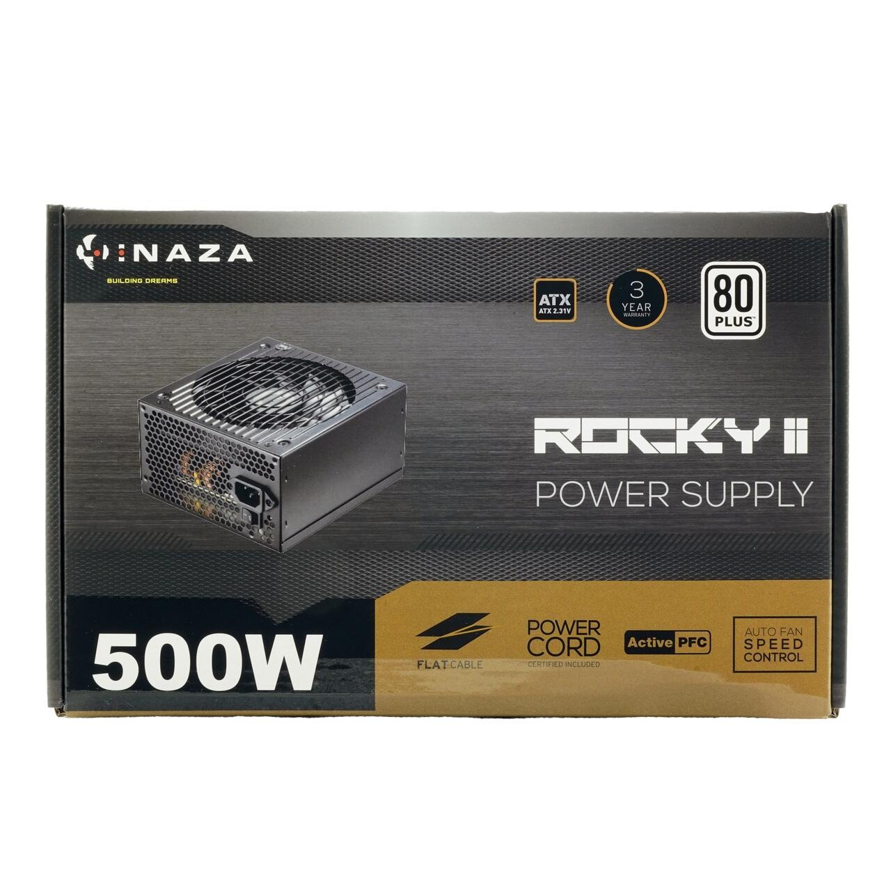 Sursa Inaza Rocky 2 500W 80Plus White, 80 PLUS White, eficienta aproximativ 80%, single rail (40A), ventilator silentios de 120mm cu control termic automat, 2x 6+2pin PCIE, 4x SATA, 2x Molex, 1x 4+4pin EPS12V(600mm), 1x 24pin(500mm), cabluri plate pentru un wire management mai bun, OVP/SCP/OPP/UVP, Active PFC