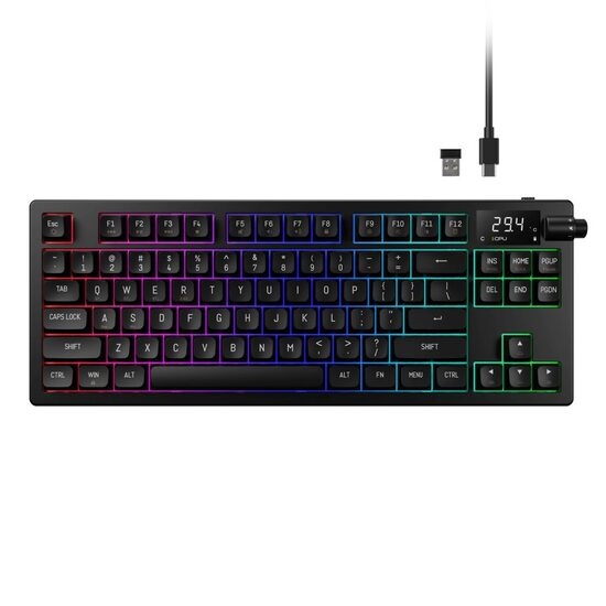 Tastatura gaming mecanica Bluetooth cu si fara fir Gamdias Hermes M7 Hybrid neagra iluminare RGB, sasiu din plastic, switch-uri rosii, keycaps-uri din PBT, toate tastele fara conflict – 84 taste (n-key rollover), protocol bluetooth: 5.0, se pot conecta 3 device-uri simultan (se selecteaza device-ul pe care il folositi din combinatia de taste FN + Q / W / E), baterie: 4000mAh, protocol wireless 2.4 Ghz. iluminare LED RGB a tastelor, display customizabil, rotita pentru reglarea volumului si a luminozitatii, IXPE Silencer Foam instalata in interiorul tastaturii, gasket din silicon, tasta WIN poate fi dezactivata in timpul jocurilor, 7 taste multimedia, conector USB Type-C, cablu USB detasabil, dimensiuni: 369x142x40mm, greutate: 820g