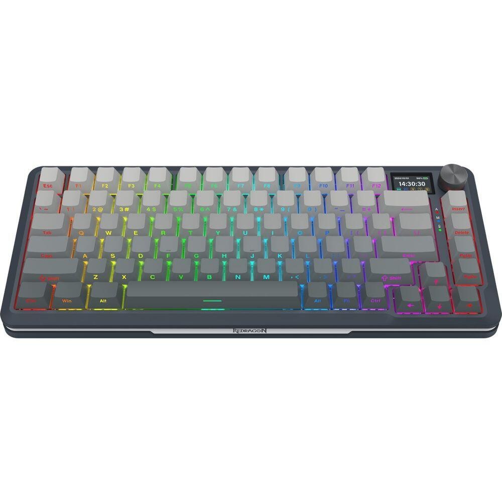 Tastatura gaming mecanica Bluetooth cu si fara fir Redragon Behemoth Pro neagra cu gri degrade iluminare RGB, sasiu din plastic, switch-uri liniare Redragon Mambo L, keycaps-uri din ABS, toate tastele fara conflict – 81 taste (n-key rollover), protocol bluetooth: 5.0, se pot conecta 3 device-uri simultan (se selecteaza device-ul pe care il folositi din swith-ul de pa laterala tastaturii), baterie: 4000mAh, protocol wireless 2.4 Ghz. iluminare LED RGB a tastelor (20 moduri de iluminare, reglarea intensitatii), display oLED 1.41 inch customizabil, rotita pentru reglarea volumului si a luminozitatii, EVA Silencer Foam instalata in interiorul tastaturii, gasket din silicon, tasta WIN poate fi dezactivata in timpul jocurilor, 6 taste multimedia, include switch-uri de schimb, compatibila cu majoritatea switch-urilor, conector USB Type-C, cablu USB detasabil, dimensiuni: 335x141x37mm, greutate: 830g
